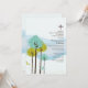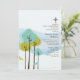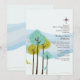 A First Holy Communion invitation featuring abstract trees in the meadow with butterflies. A layer of blue, waves across the white backdrop. The cross can be dragged to any location, made larger or smaller (+-) or eliminated making this a versatile invitation.