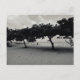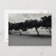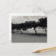 Postcard with black and white photography of a line of trees on Sanur Beach in Bali.