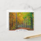Postcard with deciduous trees with foliage in fall colours and fallen leaves on a path in a forest in Hoge Veluwe nature reserve in the Netherlands during autumn season with a white edge and the text 'Netherlands'.