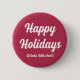 This elegant, minimalist, muted berry pink coloured button is the perfect way to add a touch of festive cheer to your holiday outfit. The text "Happy Holidays" is customisable and also the name can be personalised.