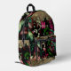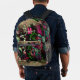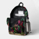 This vibrant and unique backpack is a perfect blend of style and functionality. It features a mix of green, pink, purple, and black colours, creating an eye-catching pattern that stands out. The pattern is further accentuated with yellow dots and lines, adding a touch of whimsy to the overall design. The fully customisable name is elegantly written in yellow cursive letters on the top, adding a personal touch to the design. This colourful and personalised design makes the backpack not just a utility item, but a fashion statement.