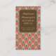 This interior designer business card has a salmon pink, grey, and cream abstract vintage peacock feather design in the background on the front. You can easily customise the business information on the front and back.
