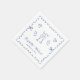 Trendy wedding napkins for your engagement party, rehearsal dinner, reception, etc., featuring a blue wavy frame adorned with coquette bows, whimsical hand drawn illustrations of hearts and toasting champagne glasses, and the names of the bride and groom in a fun, playful handwritten blue script.