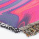 A quality printed throw has its advantages. This is a much finer weave throw than its loopier cousins, and though lighter, it is worth the investment for custom room accessorizing. The back is much prettier than the typical brown, and the fringe on the long sides very vivid, the selvage nicely done. Before photographing, I washed the throw in cold water, delicate, with a thicker woven throw the same size. On tumble dry low, this throw was dry in half the time as the other. This is a very practical quality if you use throws for furniture covers or to wrap up in frequently. The sleekness of the fabric makes it a great layer for accenting or protecting without the feeling of sitting on too much stuff. Perfect for napping or when you feel a light chill coming on. The color printing is beautiful and on this fabric, matched the design and color of my Photoshop image. This is an advantage for blending room fabrics and colors. The fringe on the short sides prints the colors from the design image and therefore varies from the side fringe. I streaked a white fractal line through the plaid pattern to give the illusion of weaving. This printed as crisp as an illusory thread, and put some white in the short side fringe, showing another advantage of print vs loomed- for artistic purposes, line lines, detail, and color integrity can be planned and preserved. My loomed throws have color limitations and more of a needlepoint texture. Print throws reproduce an exact image. The throw felt a little stiff straight out of the package, but this went away in the first delicate wash. Of course I searched the wash water for ink or bleeding and there was none.