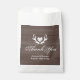 Trendy brown wood country chic deer antler wedding Favour Bag. Part of rustic hunter / hunting theme set. Cute logo design with vintage faded heart love icon. Personalise with name of bride and groom plus date of getting married. Stylish distressed script typography. Beautiful artwork for trendy wedding party. Great for thanking guests and friends with a favour or treat.