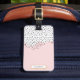 Personalised luggage tag featuring a black dots on a pink background. Customise with your name and information. Great as a gift!