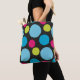 Fun tote bag with turquoise blue, pink, and lime green dots of various sizes on a black background. A modern and trendy pattern.