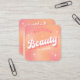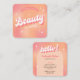 Trendy cosmetologist business cards with girly peach and pink gradient background and retro groovy style fonts that read 'Beauty' and 'hello". These stylish beauty business cards include space for your name, tag line, social media info and contact details, an easy way to make personalised contact cards for your beauty salon, lashes business, spa, makeup studio and more!