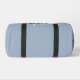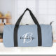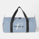 This personalised duffel bag features a monogram and first name in modern black and white script on a stylish dusty blue background.