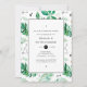Trendy bridesmaids luncheon invitation featuring green tropical beach leaves and a black and white geometric pattern.