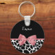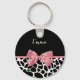 A trendy black and white giraffe print keychain with a girly rosy pink ribbon tied into a cute bow. Personalise this elegant animal print design by adding your name. Flat printed image, not actual bow.