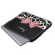 A trendy black and white giraffe print 15'' laptop sleeve with a girly rosy pink ribbon tied into a cute bow. Personalise this elegant animal print design by adding your name. Flat printed image, not actual bow.