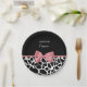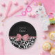 Trendy black and white giraffe print paper plates with a girly rosy pink ribbon tied into a cute bow. Personalise this elegant animal print design by adding the name of the party girl. Flat printed image, not actual bow.