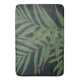 This trendy, exotic jungle foliage illustration, fashion trend print, original design is perfect for everyday wear, home decor, celebrations, and special day theme decorations. A modern elegant summer tropical foliage composed of green palm leaves with gold and green strokes, and faded light grey leaves underlay, on a bluish grey colour background.