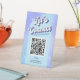 Trendy QR Code Table Top sign with holographic effect gradient background and retro fonts. This modern social media pedestal sign includes space for your scannable QR code and contact details. The groovy design and pastel blue and purple colours, is sure to stand out in your boutique, beauty salon, spa or office. Easily promote your website, social media accounts such as instagram, tiktok, facebook with this QR code sign.