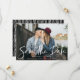 Modern save the date card featuring your horizontal engagement photo with "Save the Date" displayed in a white, hand-lettered script overlay. Personalise the front of the photo save the date card with your names, wedding date, and wedding collection. The back of the simple save the date card features an optional black and white pattern.