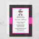 An adorable girl baby shower invitation featuring a zebra print baby carriage on a black stripe and pink polka dot design.