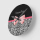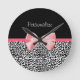 A trendy black and white leopard print clock with a cute pink ribbon bow wrapped like a present. Personalise by adding your name. Perfect present for a teen girly girl!