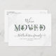 Announce your new home to family and friends with this modern design of script lettering and greenery foliage.