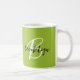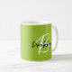 This elegant personalised coffee mug features a monogram and first name in modern black and white script on a lime green background.