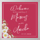 Trendy wedding welcome poster design features watercolor white daisies corner on Viva Magenta background with white customisable text blocks in modern fonts
