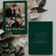 This simple, minimalist Save the Date card features a collage of one horizontal photo and two smaller square photos above the words "Save the Date" in trendy bold real gold foil typography, followed by the couple's names, wedding date and city in sans serif font on an emerald green background. Add a more detailed message with additional information on the reverse.