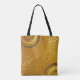 Fancy and stylish personalised tote bag design featuring faux gold and brown glittery background with gold paint splatters and circles. The text is fully customisable.