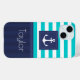 Modern nautical iPhone case with turquoise & navy blue striped pattern and customisable text.