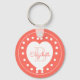 This round key ring features a coral background with coral first name and initial letter monogram over the white heart surrounded by dots. Personalise it in the text fields with a first or last name and initial, remove any text or use the edit design tool to select a typeface style, size, and colour you prefer.