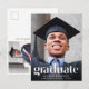 A modern graduation announcement and party invitation postcard that features your grad's photo overlayed with "Graduate" in trendy large white text and their name, school and class year in simple white typography. On the back, add an additional photo and the grad party details.
