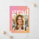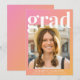 Trendy pink and orange graduation announcement card featuring a photo of the grad, "grad" in a large bold white font and her name, school and class year in simple modern white typography.