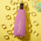A chic personalised pink monogram bottle cooler for a girl who loves simple, handwritten gifts. Beautiful white cursive script down the side spelling out your name in elegant script.