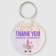 Birthday thank you keychain. Designed with a trendy pink unicorn. Adorned with a fancy floral headpiece. Whimsical butterflies flying around. Fake gold confetti sprinkled along the top. A pale purple and yellow watercolor background.