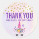 Birthday or baby shower thank you stickers. Designed with a trendy pink unicorn. Adorned with a fancy floral headpiece. Whimsical butterflies flying around. Fake gold confetti sprinkled along the top. A pale purple and yellow watercolor background.