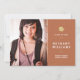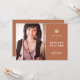 This contemporary graduation announcement features a modern design with a terracotta orange and white colour palette. Add your favourite photo of the new grad and edit the text template with the graduate's name, graduation year, and school. A gold graduation hat sits above the typography design. Graduation party details can be added to the back of the card.