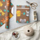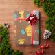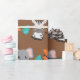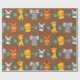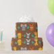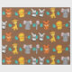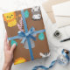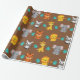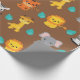 A trendy safari themed wrapping paper featuring lions, giraffes, zebras, tigers, and elephants on a brown background. Great for a birthday party, order yours today!