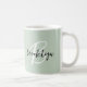 This elegant personalised coffee mug features a monogram and first name in modern black and white script on a sage green background.