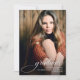 This trendy stylish graduation announcement features beautiful script text spelling out the word graduation with a text template to personalise with the name, school and graduating year. Load your desired vertical photo in place of the sample photo shown in the design template. The back of this announcement has been intentionally left blank. You can customise further by adding additional text on the back of the card if you desire.
