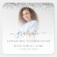 Trendy Silver Glitter Photo 2024 Graduation. A faux glitter border is at the top are at the top and Graduate is in an elegant script with swashes. Easily personalise the text to your own requirements, and replace the sample image with your own. To keep the minimalist contemporary look of this design, a photo with a light coloured background will work well.