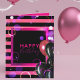 Trendy stylish personalised birthday card design featuring black, pink and purple balloons on a glowing pink and black horizontal striped background. The text is fully customisable.