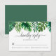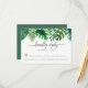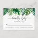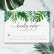 Tropical wedding RSVP card design featuring watercolor leaves, including monstera, palm, and banana leaves, on a white background. The reverse side showcases a deep green colour.