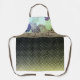 On this stylish apron is a colourful bouquet of flowers of green, blue and purple hues on the top then a brown ribbon where you can personalise it to make it uniquely your own then below that is a light green and black chequered half tone gradient pattern. Classy trendy vibes.