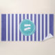 Pretty and trendy cabana stripe beach towel in Very peri (blue violet shade) and white striped pattern with your monogram inside an abstract aqua blue circle.
