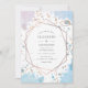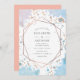 Wedding invitation with purple and blue watercolor splashes and a geometric rose gold frame and reverse.
