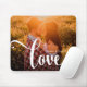 This stylish and fun mouse pad features the word "love" in modern and whimsical white text, with room for your names. Your favourite photo fills the background.