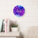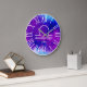 Trendy zodiac Libra symbol wall clock featuring a pretty purple and blue space nebula design.
