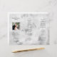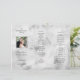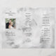 Black and white, folded, floral wedding program with photo template. Customise three sections with black text. Add a picture of the couple to the left / front of the program. White hydrangea flowers are the background image.