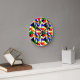 This wall clock has a Bauhaus design of a collage of triangles in red, yellow, orange, blue, and green.