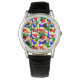 This watch has a Bauhaus design of a collage of triangles in red, yellow, orange, blue, and green.