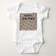 This baby bodysuit has a geometric design of repeating brown and tan triangles with turquoise circles on top on a field of off-white. Want the same design in different colours? Message me.